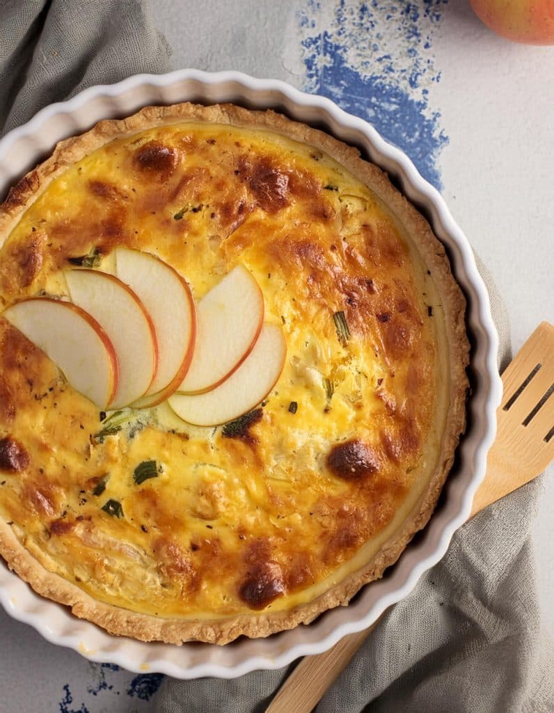 An intriguing twist on classic dishes, blending the savoury depth of a quiche with the sweet, comforting flavours of apple pie.