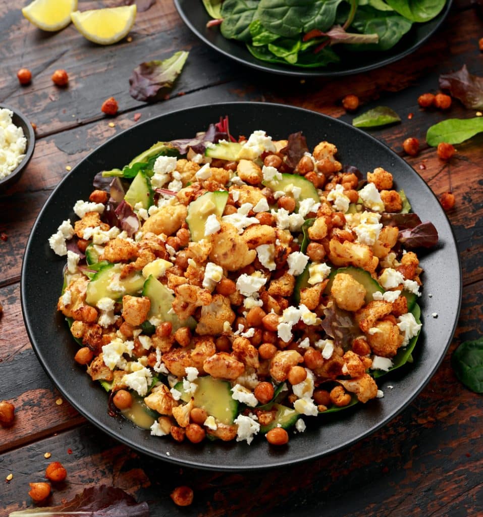 Harissa roasted cauliflower salad with chickpea, cucumber, greens and feta cheese