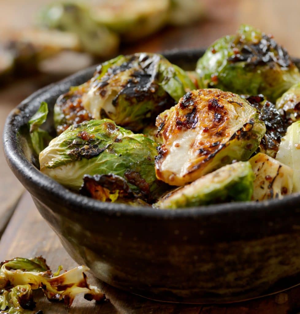 Crispy, baked, seasoned Brussel sprouts with tangy balsamic glaze