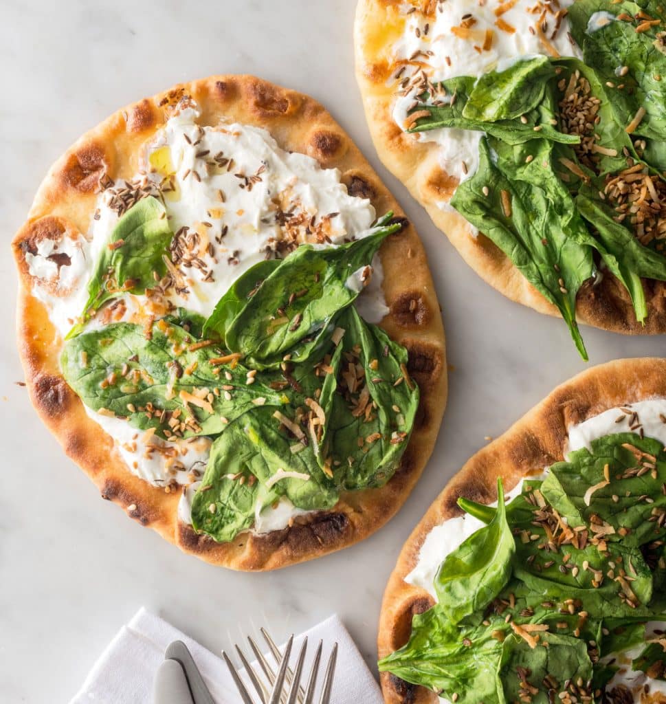 Spinach and Greek yogurt with Indian naan pizza