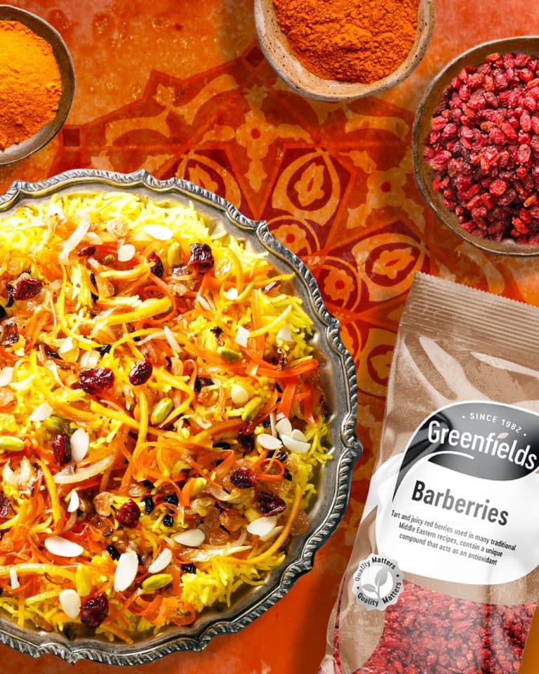 Greenfields Dried Barberries are small but mighty – jewel-like berries that have been dried to capture their naturally tart, citrusy tang. Known as Zereshk in Persian cooking, they’re a hallmark of traditional rice dishes, adding colour, flavour, and a subtle sparkle to the plate. In the kitchen, they’re as versatile as they are beautiful: stir through buttery rice, scatter over salads, or fold into stuffing for poultry.