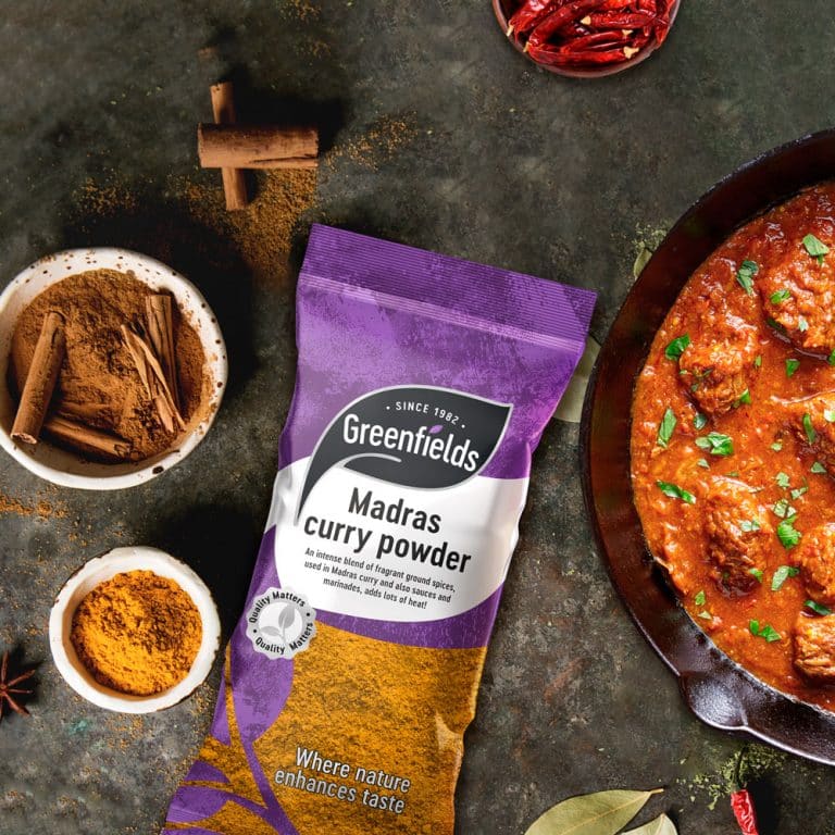Our Greenfields Madras Curry Powder is carefully crafted from a balance of cumin, coriander, black pepper, cassia, cassia leaf, fennel seeds, star anise, ginger, turmeric, nutmeg, fenugreek, clove, mustard and salt. Together they create a rounded flavour that is earthy, aromatic and gently fiery – making it as versatile in modern kitchens as it is in traditional curries.